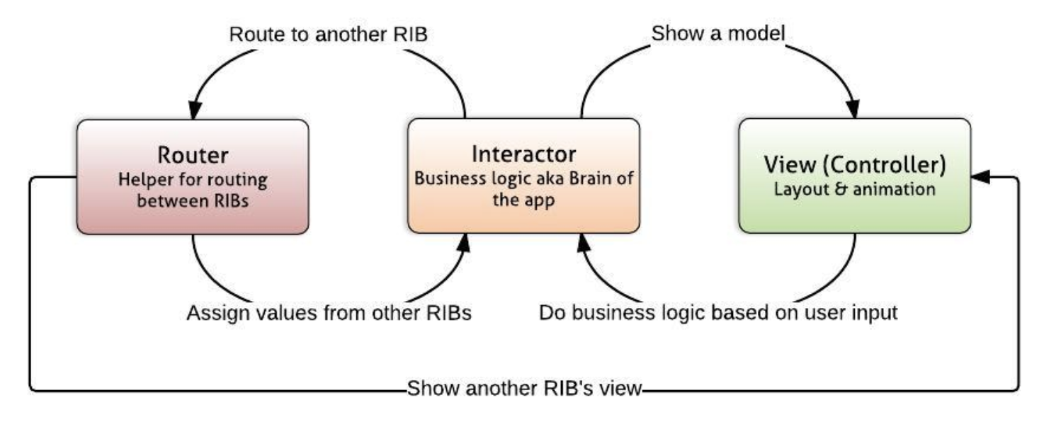 1 2 3 4 5 6 7 8 9 10 11 12 13 14 15 16 17 18 19 20 21 22 23 24 25 26 27 28 29 30 31 32 33 34 35 36 37 38 39 40 41 42 43 44 45 46 47 48 49 50 51 52 53 54 | let interactor = GreetingInteractor() /* Interactor - Business Logic 담당. - state 변화, data 저장장소, RIBs 이동 결정. */ let router = GreetingRouter() /* Router - Interactor의 변화를 감지하고 child RIBs를 연결할지 뗄지 결정 - HumbleObjects : Interactor의 Testability 확보 - RIBs 간의 직접적인 소통이 아니라 Router를 거쳐 Interactor 간의 소통 - Routing 알고리즘을 통해 Interactor의 역할을 부담함으로써 core 비즈니스 로직에 집중. */ let builder = GreetingBuilder() /* Builder - RIBs의 모든 구성 class 작성 로직을 담당 - 로직을 분리함으로써 Mockability 확장 및 DI 독점 */ let dependency = GreetingDependency() /* Dependency - 특정 RIB가 Parent RIB로부터 인스턴스화해서 받아야할 종속성(변수,함수)을 나열하는 프로토콜. */ let component = GreetingComponent() /* Component - RIB Dependency를 관리. (Dependency 프로토콜의 구현) - Builder를 보조하여 RIB 구성요소를 생성. - Parent RIB의 Component는 Parent RIB의 Dependency 사용을 위해 Child RIB의 Builder에 주입된다. */ // MARK: Optional let presenter = GreetingPresenter() /* Presenter - 정적인 Stateless class 이다. - Business model 을 View model로 변환할때 사용 - 하지만 이 변환이 너무 사소할 때가 많아 optional 이다. */ let view = GreetingViewController() /* View(Controller) - UI layout 작업 - 가능한한 "dumb"하게 작성한다. */ component.dependency = dependency builder.component = component presenter.view = view interactor.presenter = preseneter builder.interactor = interactor router.routing = builder.build() | cs |