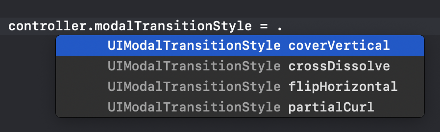 뷰 컨트롤러를 표시하는 데 사용될 애니메이션을 결정합니다. 뷰 컨트롤러의 modalTransitionStyle 프로퍼티로 지정할 수 있습니다.