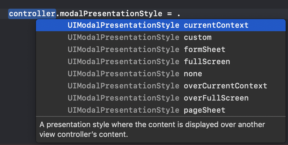UIkit 안에 여러 스타일이 내장되어 있으며 커스텀한 스타일을 적용하여 화면을 나타낼 수도 있습니다. 뷰 컨트롤러의 modalPresentationStyle 프로퍼티에 적절한 상수를 할당하면 됩니다.